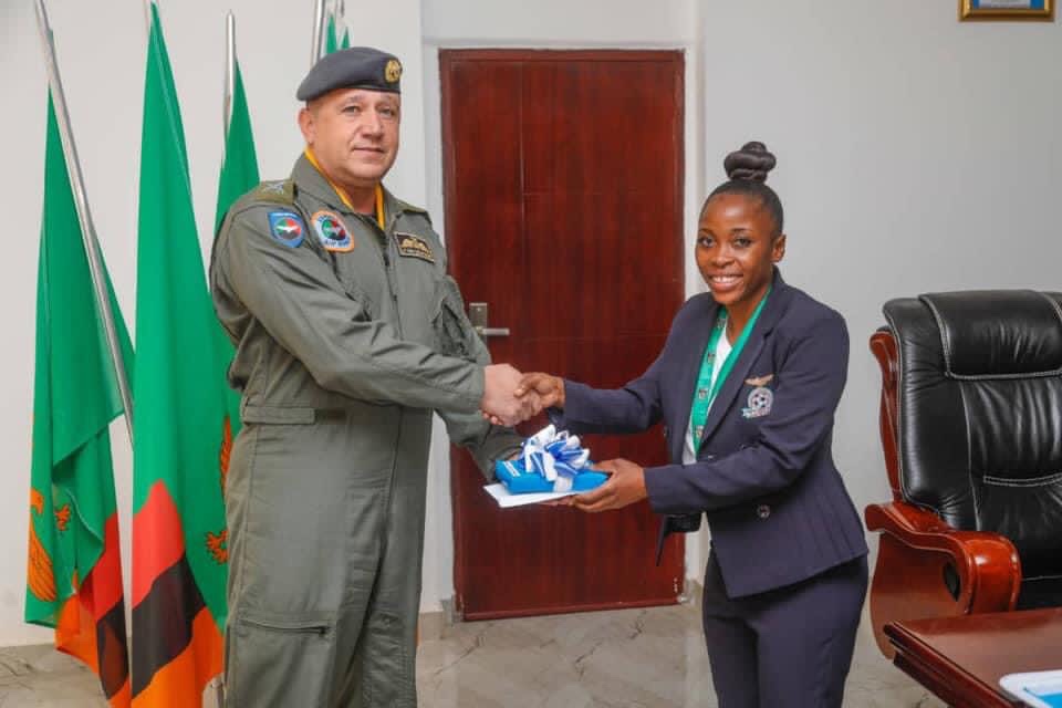 “Lt Gen Colin Barry was speaking when he hosted Red Arrows Women and Copper Queens players Margret Belemu, Mary Wilombe and Ochumba Oseke Lubanji at Zambia Air Force Headquarters on Friday, 05 July 2022.